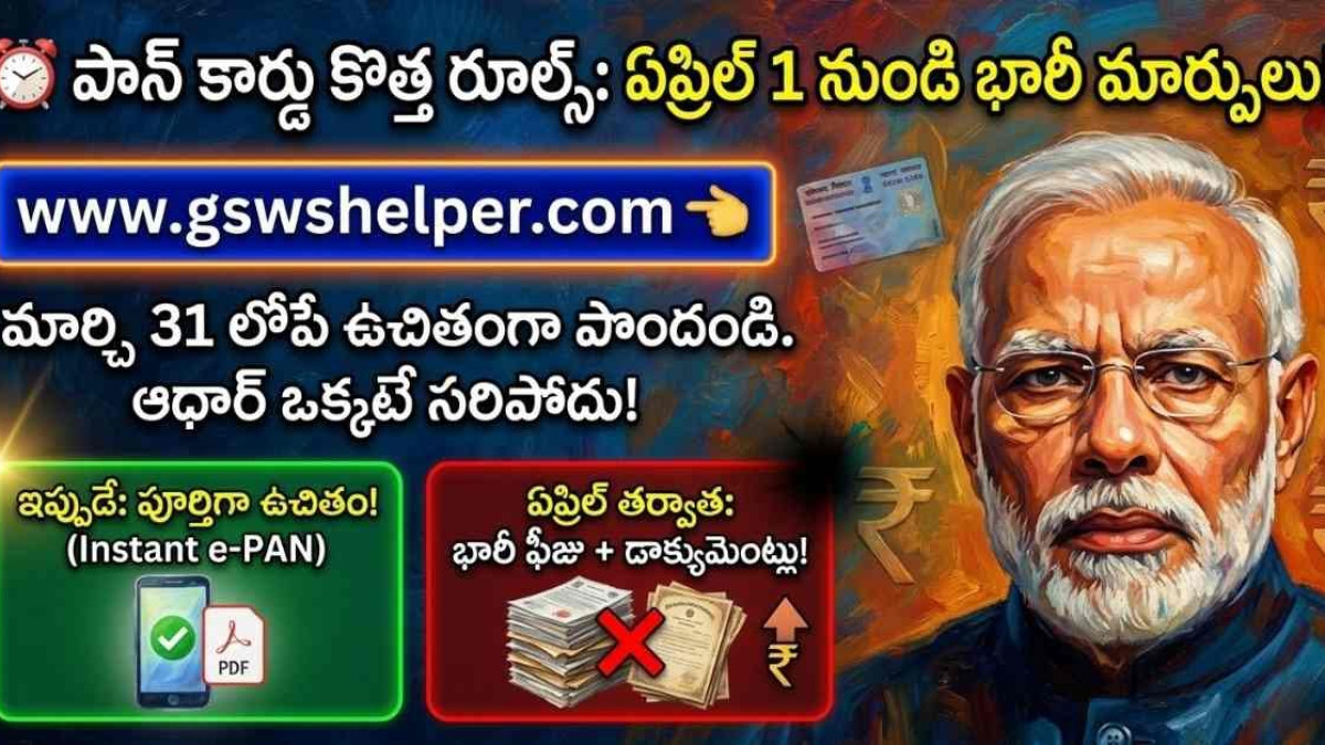 ఏప్రిల్ 1, 2026 నుండి పాన్ కార్డ్ కొత్త నియమాలు: మార్చి 31 లోపు ఆధార్తో ఉచిత ఇన్స్టంట్ PAN అప్లై చేయండి. అదనపు డాక్యుమెంట్లు, ఫీజు లేకుండా పొందుకోండి!